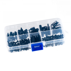 Voici la boite indispensable avec 180 vis, écrous et entretoises diverses en nylon noir en taille M2