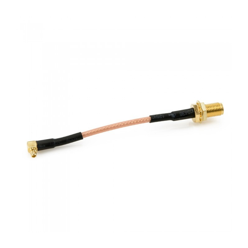 Câble adaptateur Pigtail avec d'un côté un connecteur MMCX coudé à 90° et de l'autre un connecteur RP-SMA ou SMA femelle droit.