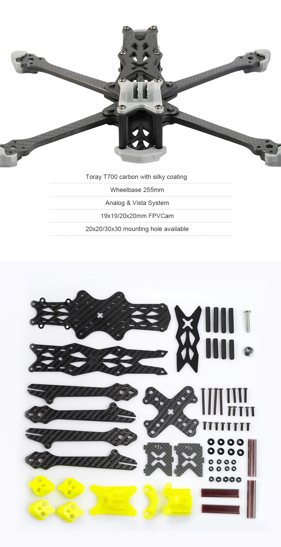 Les composants du châssis Aura Pro 6 pouces Freestyle de Foxeer sont moulés en carbone T700 gage de solidité et de poids maîtrisé (118 g).