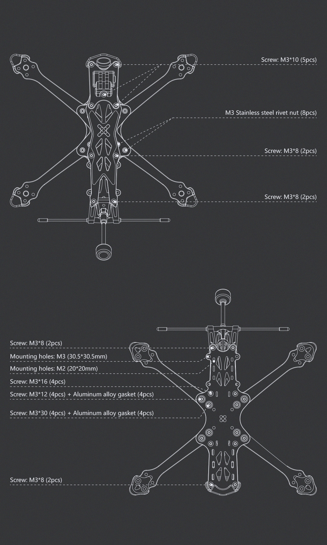 De nombreuses pièces en TPU sont fournies : support caméra, support antenne, protections de bras, protection de bottom plate, module Vista et DJI, ..