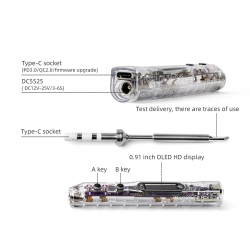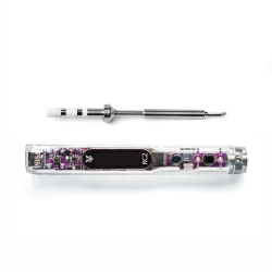 Ensemble de soudure comprenant un fer à souder intelligent de 65W doté d'un écran de contrôle OLED avec température réglable de 50 à 450° et ses accessoires dans une petite valise imitation carbone.