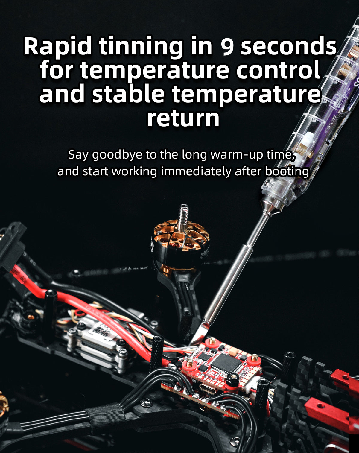 Ce kit est livré dans une sacoche coquée avec une panne de précision, un adaptateur XT60 pour l'alimenter sur le terrain à partir d'une batterie LiPo, un support avec éponge.